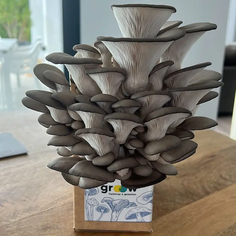 Este é o Kit de Cogumelos Pleurotus ostreatus, conhecidos como cogumelos ostra, uma solução prática e pronta a usar para cultivar deliciosos cogumelos em casa.